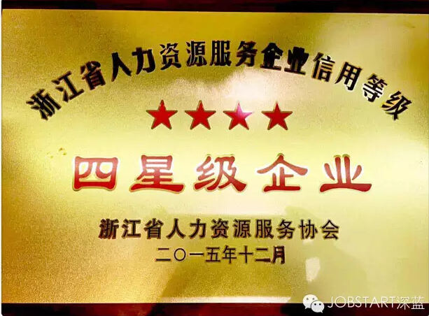 2016年1月6日,在杭州召開的浙江省人力資源服務協(xié)會第一屆第三次會員大會典禮上,包括寧波杰博人力資源有限公司在內的17家人力資源企業(yè)獲評首批“浙江省人力資源服務星級企業(yè)”殊榮,其中,杰博人力資源獲評“四星級”企業(yè)。